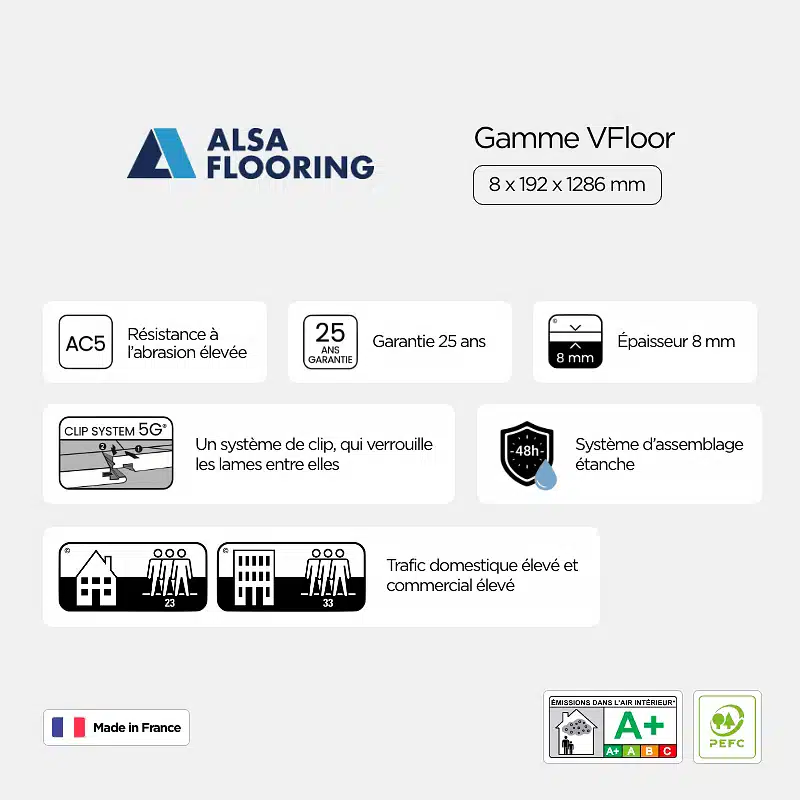 Dotée du système d’assemblage 5G, la gamme Vfloor simplifie l’installation de ce revêtement. Classée en usage niveau 23-24, elle se prête parfaitement à un usage domestique intensif, notamment dans des espaces tels que le salon ou les séjours.