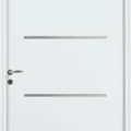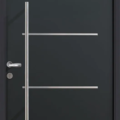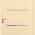La porte contemporaine SAORI, avec ses décors ton inox horizontaux, s’harmonise avec toutes les entrées.